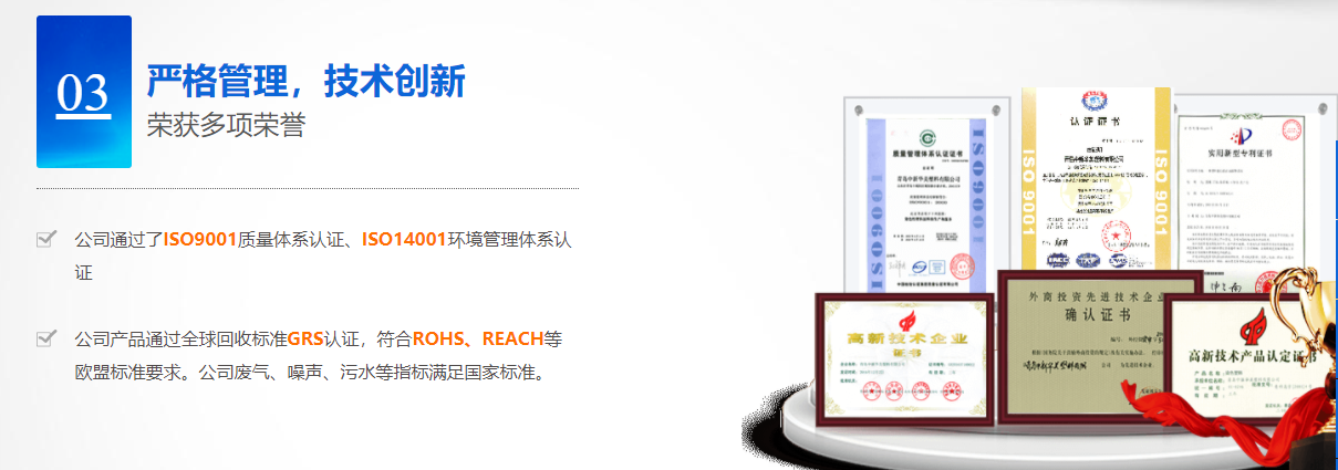 河南平遠新材料科技有限公司已通過ISO9001質量體系、14001環境體系、45001職業健康安全管理體系認證;GRS全球回收標準認證;美國UL OBP 2809趨海塑料認證;BSCI商業社會標準認證;LCA生命周期認證。